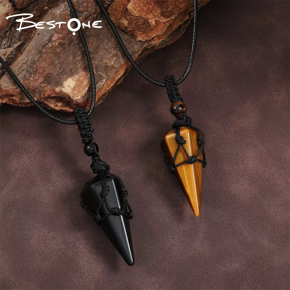 Featuring Green Aventurine, Obsidian, Lapis Lazuli, Amethyst, Clear Quartz, Yellow Tiger Eye, and multicolor stones, each 35×16mm cone pendant is paired with an adjustable wax leather cord. Perfect for boutique stores, gifting, and B2B wholesale, this energy stone jewelry set promotes balance and positive energy.