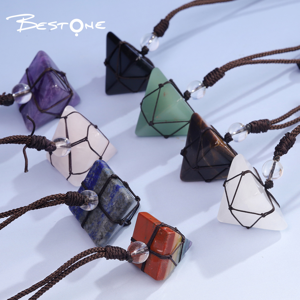 Boost your collection with this Natural Crystal Pyramid Necklace featuring 8 semi-precious energy stones: Amethyst, Rose Quartz, Tiger Eye, Clear Quartz, Obsidian, Green Aventurine, Lapis Lazuli, and Rainbow Crystal. Each 2.5×2.5cm pyramid hangs on a durable adjustable brown cord. Perfect for healing crystal lovers, seven chakra enthusiasts, boutiques, online stores, and wholesale buyers.